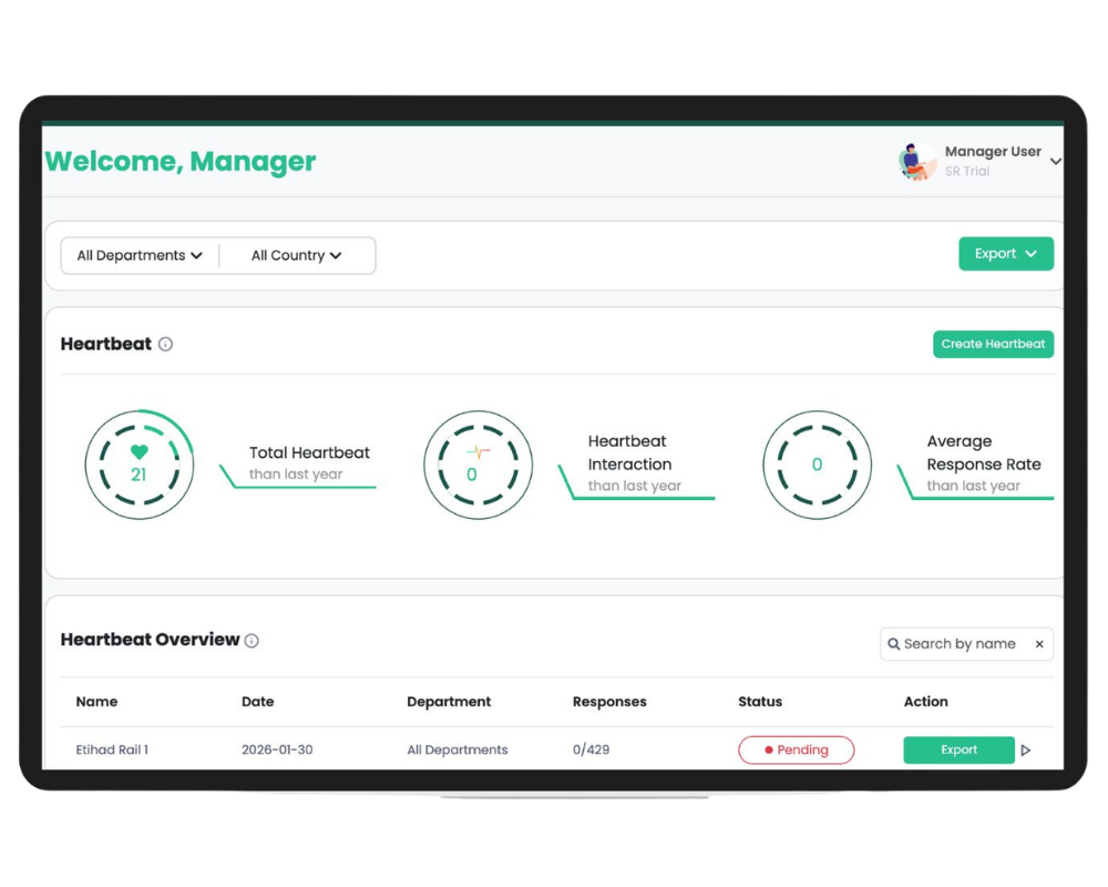 When you need deeper clarity, Heartbeat surveys capture tailored insights across engagement, wellbeing, performance, inclusion, onboarding, retention, and more — turning signals into structured understanding.